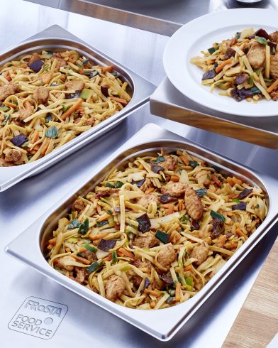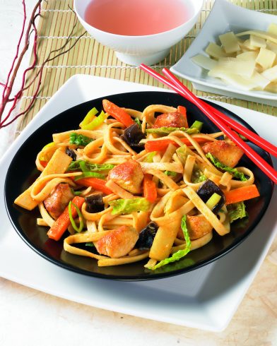 Makaron tagliatelle gotowany (woda, mąka z PSZENICY durum, JAJA) 32 %, marynowana, gotowana pierś z kurczaka (pierś z kurczaka, sól, olej sojowy, dekstroza) 16 %, marchew, por, kapusta włoska, cebula, sos sojowy