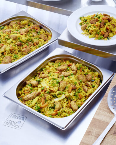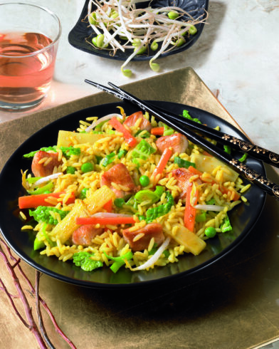 Ryż gotowany (woda, ryż, sól) (33 %), marynowana, gotowana pierś z kurczaka (pierś z kurczaka, sól, olej sojowy, dekstroza) (17 %), groszek, marchew, por, kiełki fasoli mung, kapusta włoska, cebula, pędy bambusa, olej rzepakowy, sos sojowy (woda, NASIONA SOI, PSZENICA, sól), sól, curry w proszku (kurkuma, kmin rzymski, kolendra, NASIONA GORCZYCY, pieprz kajeński, koper włoski, nasiona kozieradki), cukier, płatki kokosowe, czosnek.