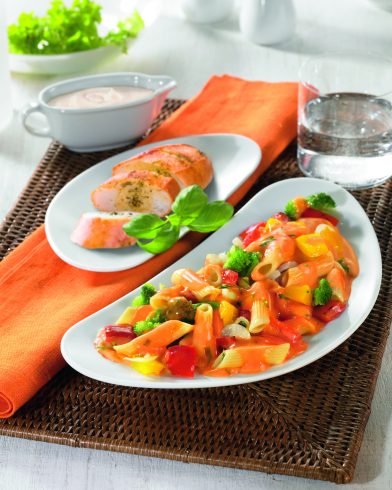 Gotowany makaron penne 28 % (woda, mąka z PSZENICY durum), czerwona i żółta papryka 15 %, ŚMIETANKA 10 %, pomidory 10 %, brokuł, MLEKO, cebula ,oleje roślinne (słonecznikowy, rzepakowy), przecier pomidorowy, sól, czosnek, woda, zioła (bazylia, pietruszka), przyprawy (papryka, pieprz kajeński, lubczyk, kurkuma, pieprz, goździki, liść laurowy), skrobia ryżowa, cukier, maltodekstryna, pasternak w proszku, marchew w proszku, sproszkowane borowiki.