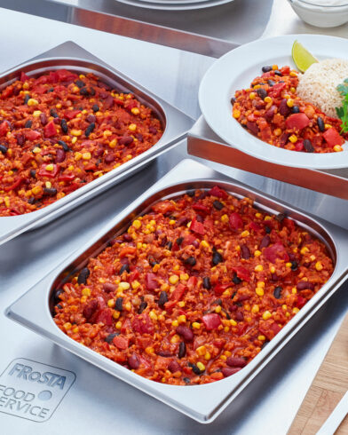 Starty kalafior, czerwona papryka, pomidory, woda, wegański preparat białka grochu (woda, białko grochu (2%), tłuszcz kokosowy, cebula, substancja zagęszczająca: metyloceluloza, błonnik grochowy, ocet spirytusowy, syrop klonowy, sól wędzona (sól, dym), skrobia ziemniaczana, przyprawy (czarny pieprz, czosnek), burak w proszku, syrop karmelowy, zawiera olej słonecznikowy i/lub olej rzepakowy, koncentrat soku cytrynowego, ekstrakt przypraw) (10%), słodka kukurydza (9%), gotowana czerwona fasola (woda, czerwona fasola, sól) (8%), smażona cebula (cebula, zawiera olej słonecznikowy i/lub olej rzepakowy), przecier pomidorowy, gotowana czarna fasola (woda, czarna fasola), olej słonecznikowy, sok pomidorowy, przyprawy (papryka, czosnek, pieprz kajeński, kmin rzymski), sól, bulion warzywny (marchew, cebula, por, sól, woda, oliwa z oliwek extra virgin), skrobia ryżowa.