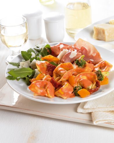 Gotowany makaron tortelloni 38 % (mąka z PSZENICY durum, woda, mąka PSZENNA, szpinak, SER RICOTTA, JAJA, SER MOZZARELLA, sól, przyprawy (cebula, gałka muszkatołowa, pieprz, kurkuma), bazylia, emulgator: mono- i diglicerydy kwasów tłuszczowych), żółta papryka, brokuły, woda, przecier pomidorowy, ŚMIETANKA, suszone pomidory 3 % (pomidory, sól), olej słonecznikowy, cukier, sól, czosnek, przyprawy (pieprz kajeński, pieprz).