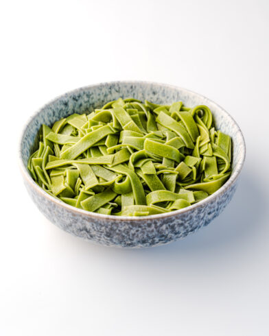 Zielony makaron wstążki. Produkt głęboko mrożony.