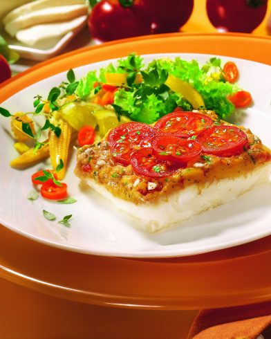 filety z MINTAJA 56%, pomidory 14%, ŚMIETANA, MOZZARELLA 3,5%, mąka PSZENNA, margaryna (olej rzepakowy, tłuszcz palmowy, woda, emulgatory (lecytyny słonecznikowe, mono- i diglicerydy kwasów tłuszczowych), kwas kwas cytrynowy), cebula, ŚMIETANKA, woda, czerwona papryka, przecier pomidorowy, modyfikowana skrobia kukurydziana, zioła (bazylia, pietruszka, koperek, szczypiorek), sól, SER, cukier, maltodekstryna, czosnek w proszku, przyprawy (lubczyk, kurkuma, pieprz, liść laurowy, goździki), drożdże, olej rzepakowy, warzywa w proszku (pasternak, marchew), sproszkowane borowiki.