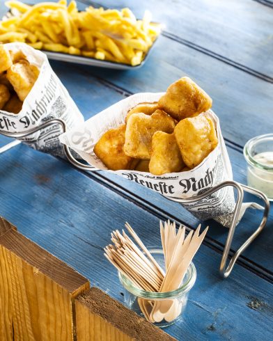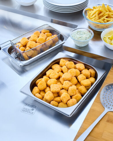 Formowane filety z mintaja z certyfikowanych łowisk MSC, w chrupiącym cieście, podsmażane. Z połączonych kawałków ryby. Produkt głęboko mrożony.
