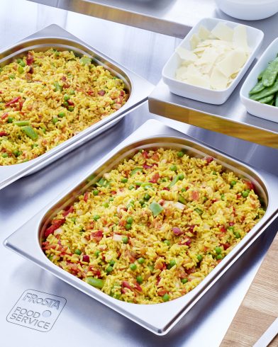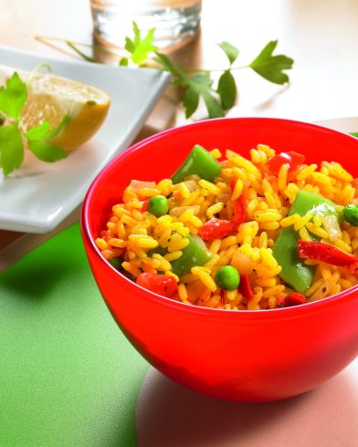 Ryż gotowany 49 % (woda, ryż, sól, przyprawy (kurkuma, szafran), zawiera olej słonecznikowy i/lub olej rzepakowy), cebula, pomidory, papryka czerwona, fasola Romano, groszek, MASŁO, zawiera olej słonecznikowy i/lub rzepakowy, sól, przecier pomidorowy, oliwa z oliwek, zioła (bazylia, tymianek, pietruszka), cukier, czosnek, LAKTOZA, przyprawy